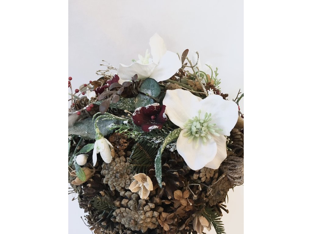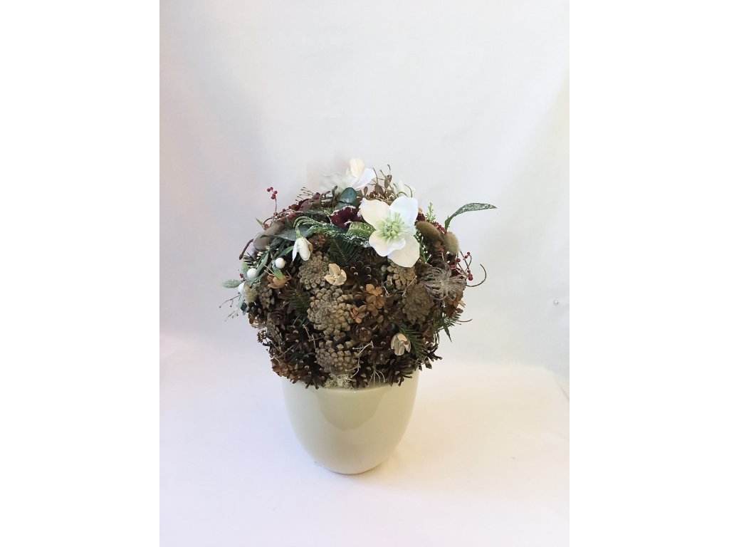 Materiál: keramický obal, přírodní materiál, látkový květ čemeřice, sněženky, jmelí